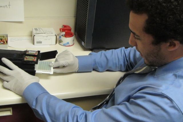 Traditional ELISA testing is performed with small transparent plates that resemble honeycombs, typically with 96 tiny wells. Samples are placed in the wells first, followed by small amounts of fluid containing specific antibodies that bind to antigens in the samples.