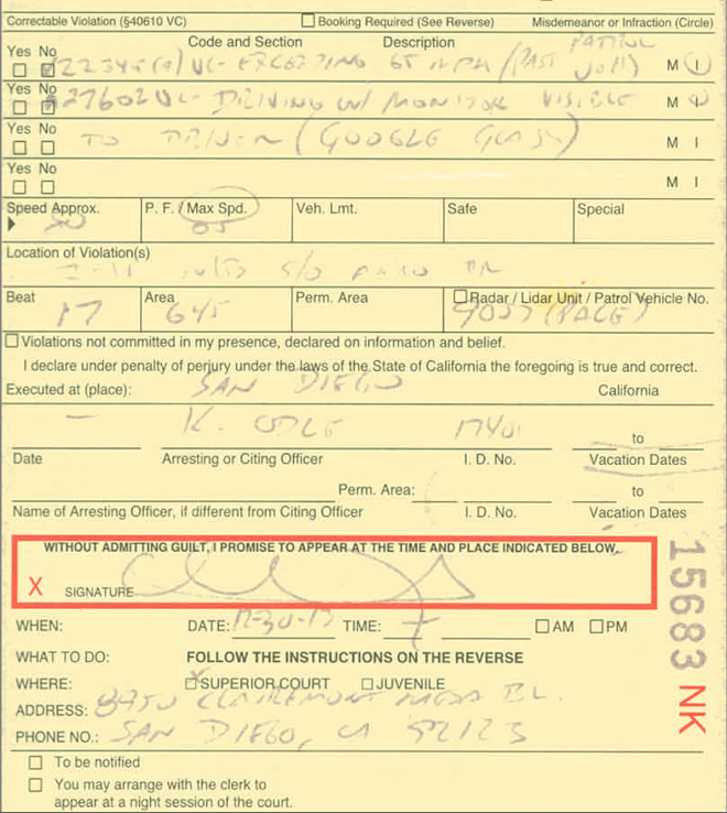 Abadie was driving in San Diego when an officer pulled her over for speeding. The primary infraction was for going 15 mph over the speed limit, but there was a secondary offense scrawled on the ticket: “driving w/ monitor visible to driver (Google Glass).”